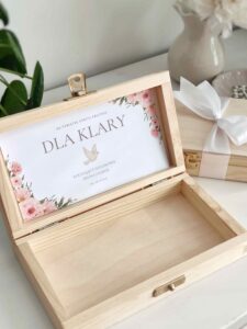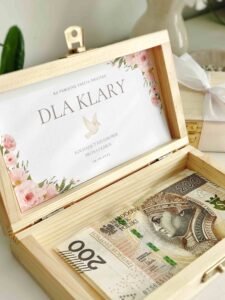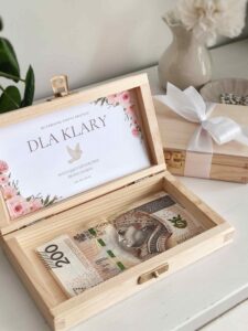 Pakując na prezent pieniądze do drewnianego pudełka, podarujesz nie tylko eleganckie opakowanie, ale także szkatułkę, która może stać się pudełkiem na wspomnienia, małe pamiątki.