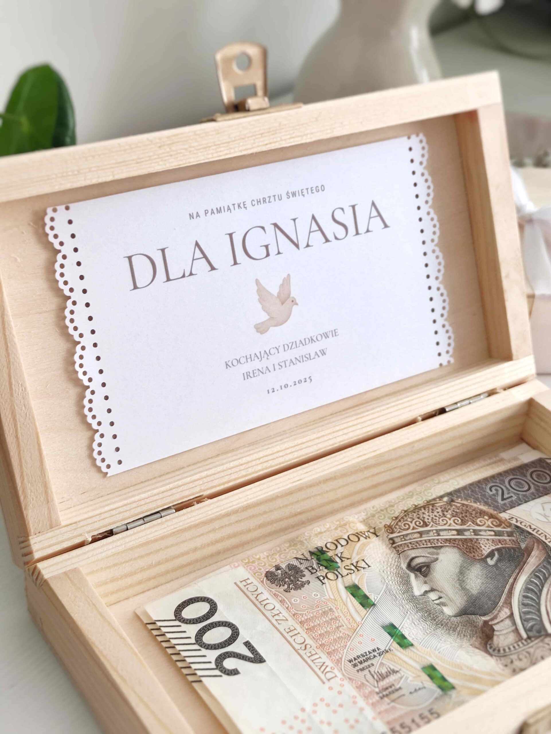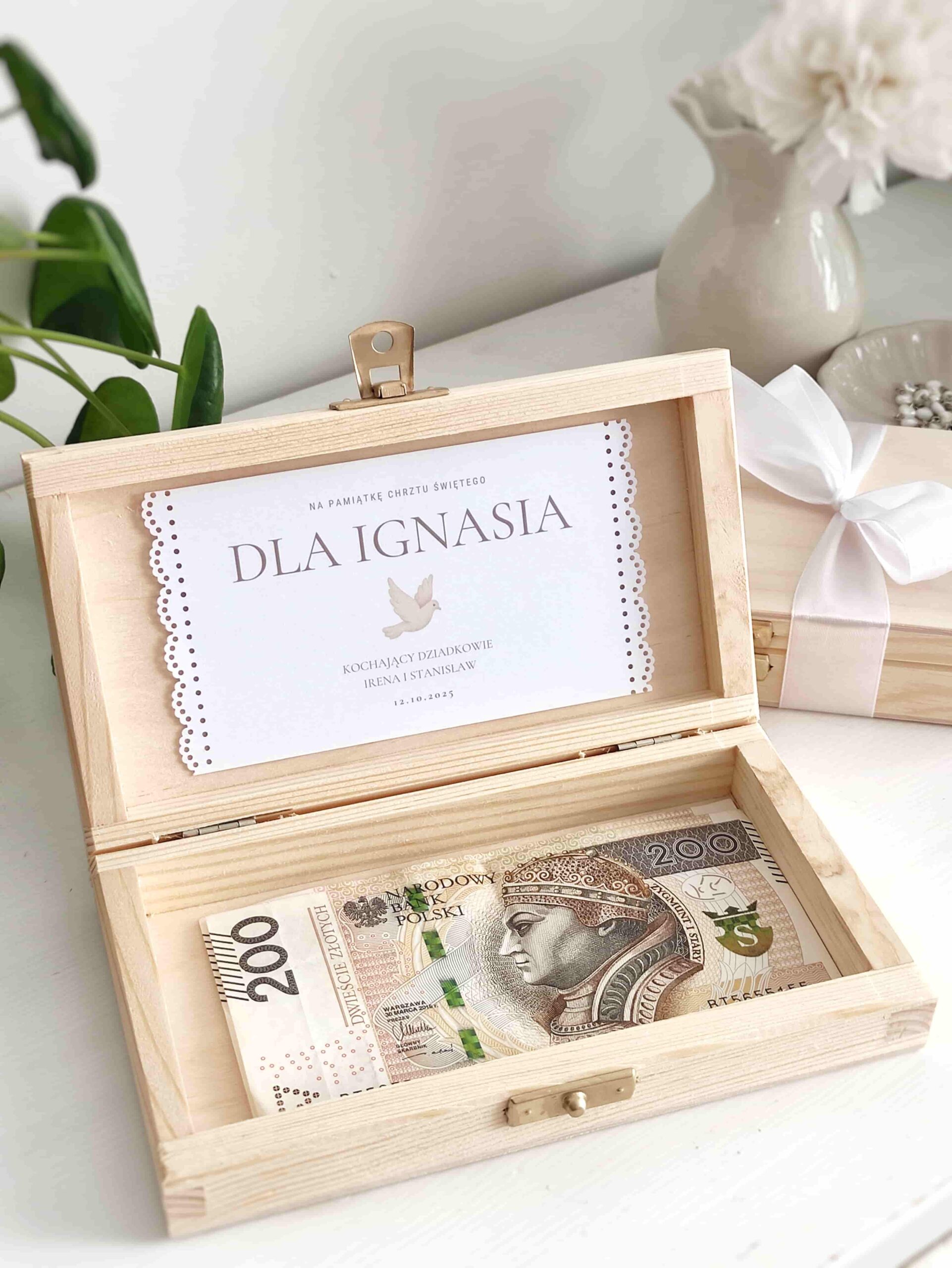 W tej ofercie kupisz drewniane pudełeczko z zamknięciem, udekorowane białą wstążką oraz z personalizowaną dedykacją w środku. Idealny upominek na Chrzest Święty, jako dodatek do prezentu.