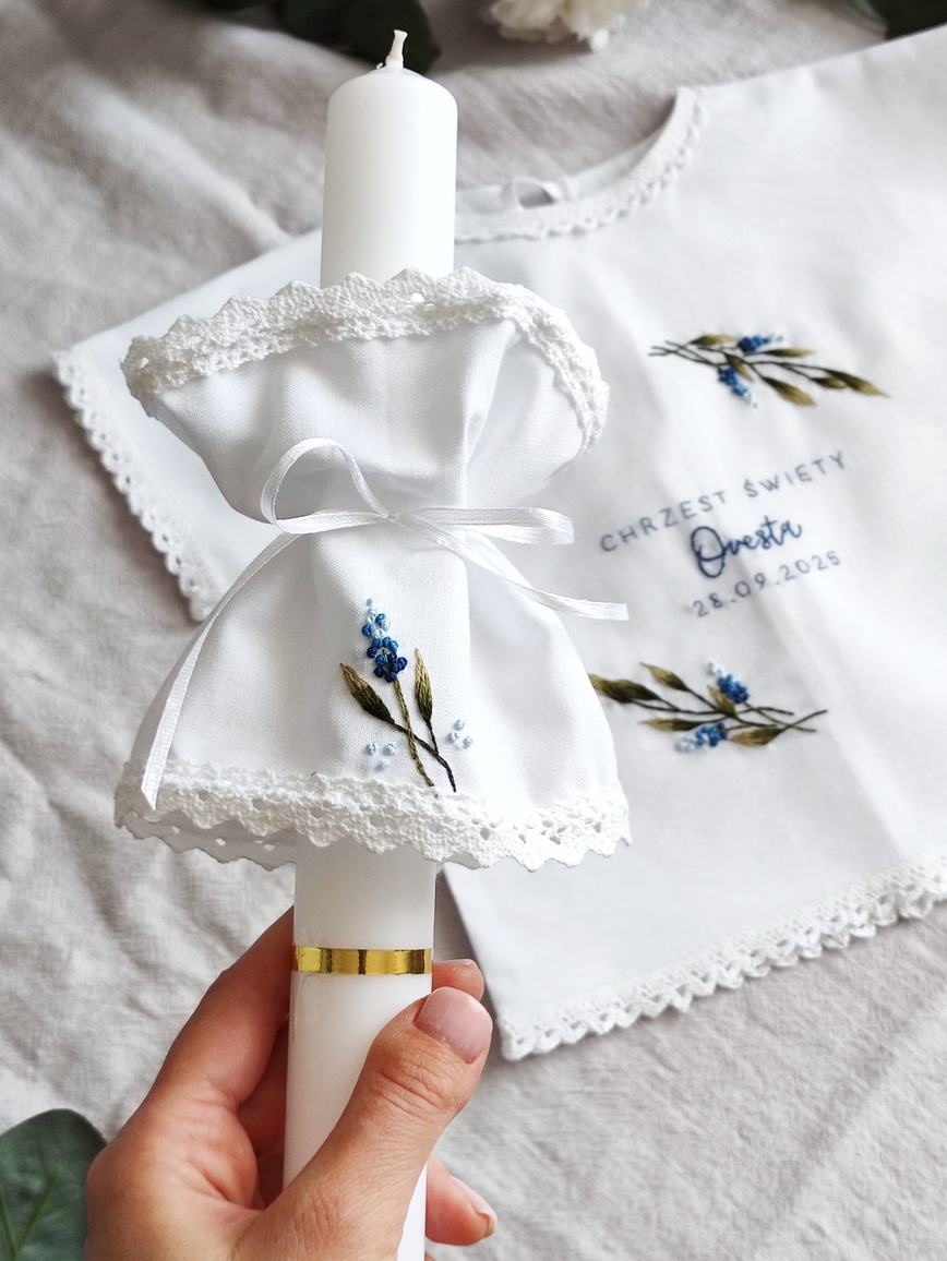 Wspaniały komplet podarunkowy z okazji Chrztu Świętego: biała szatka oraz profitka do świecy z eleganckim roślinnym motywem:
