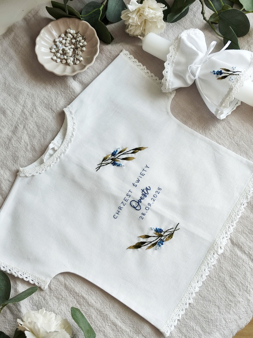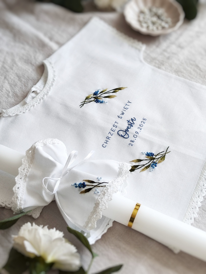 Elegancki komplet na Chrzest Święty z haftowanym imieniem, datą. Zestaw z drewnianym pudełkiem.