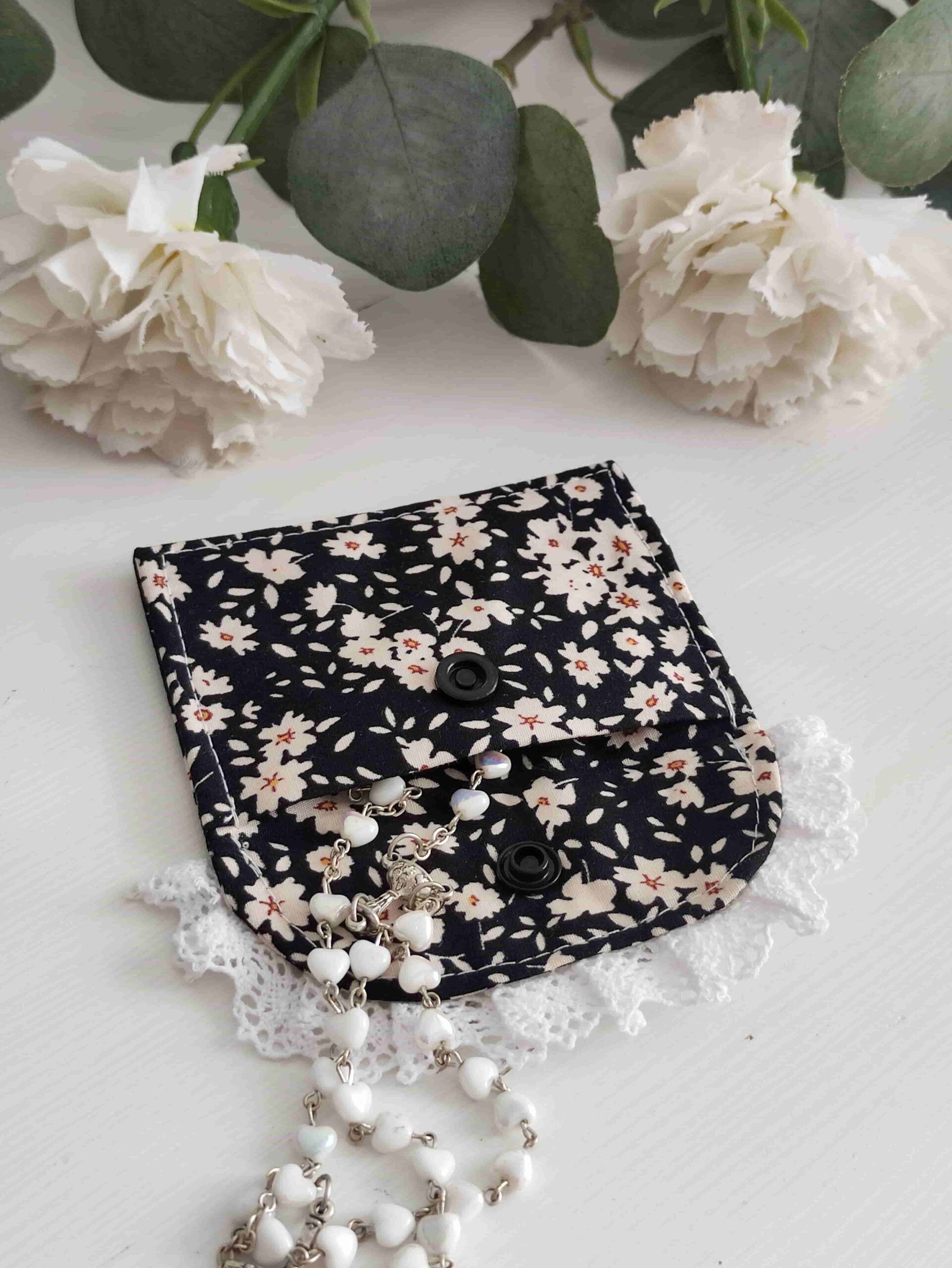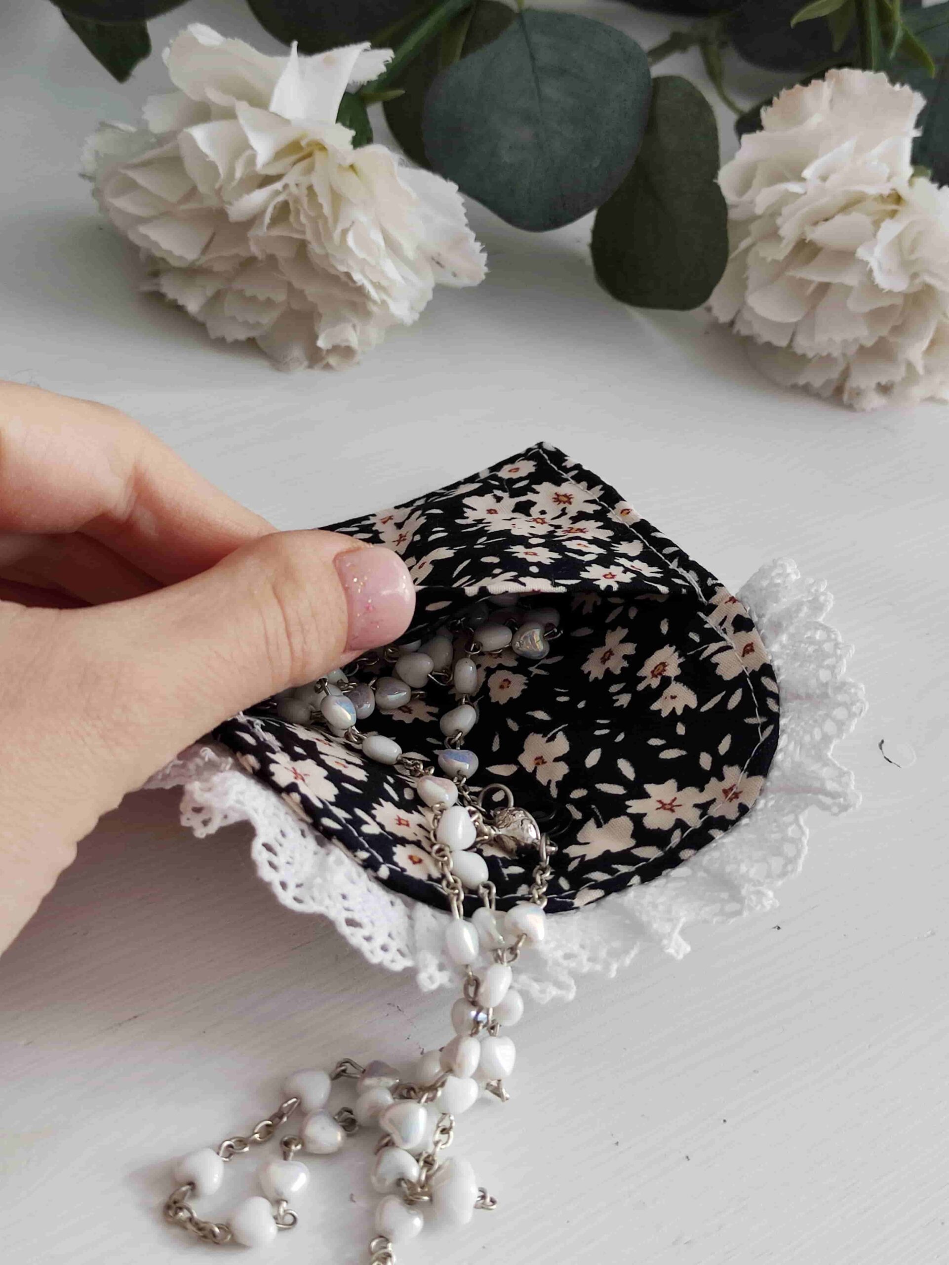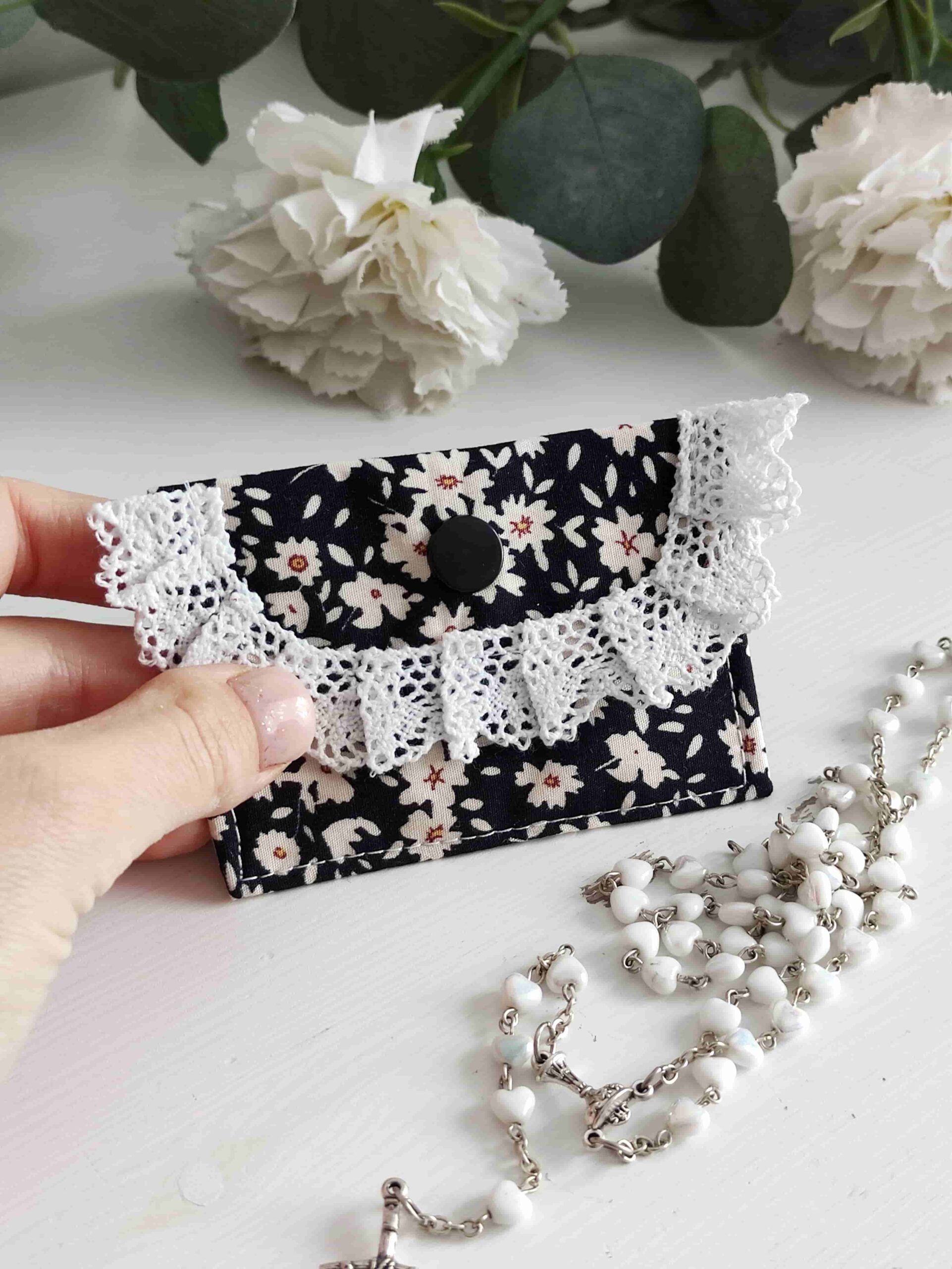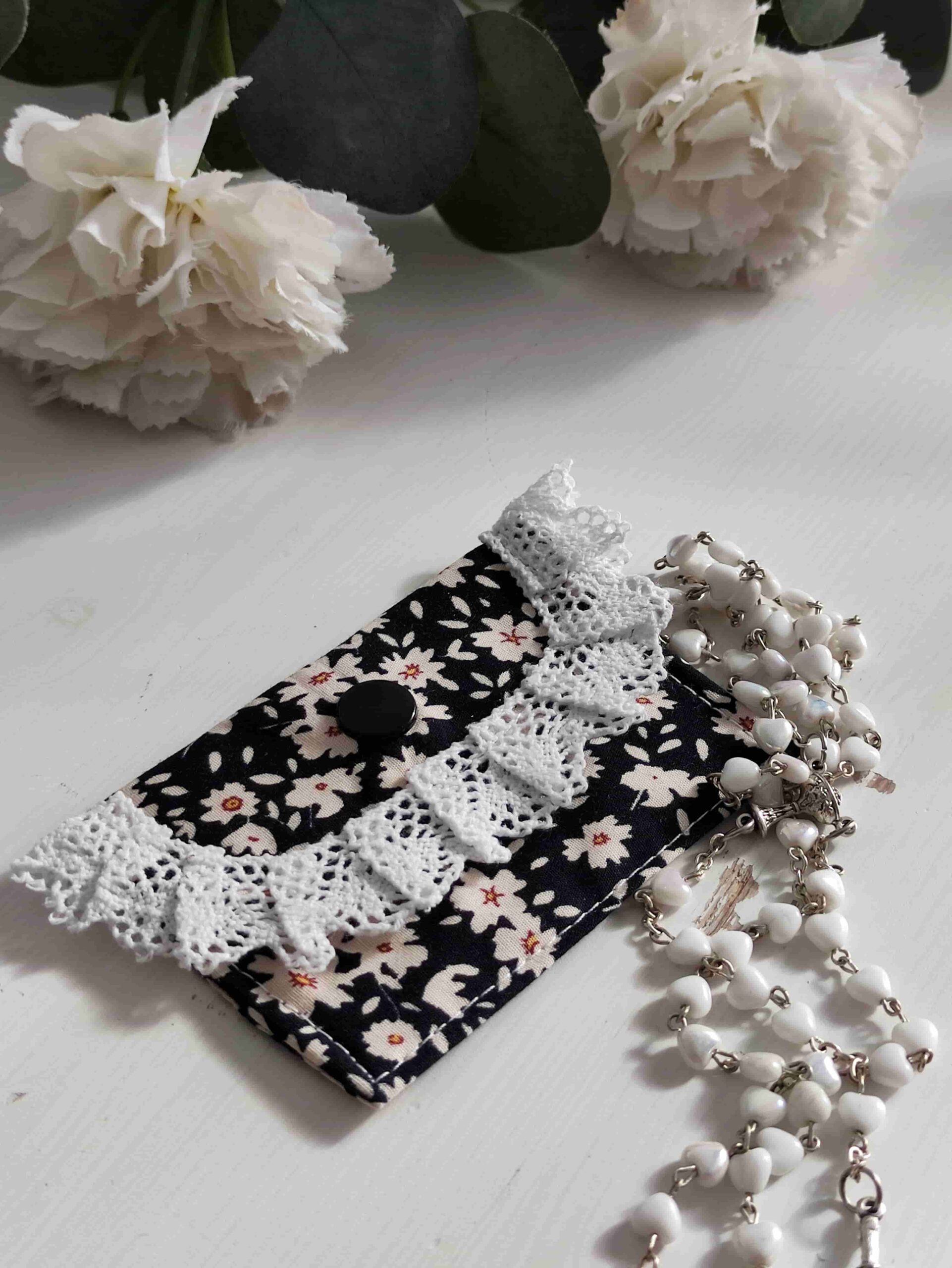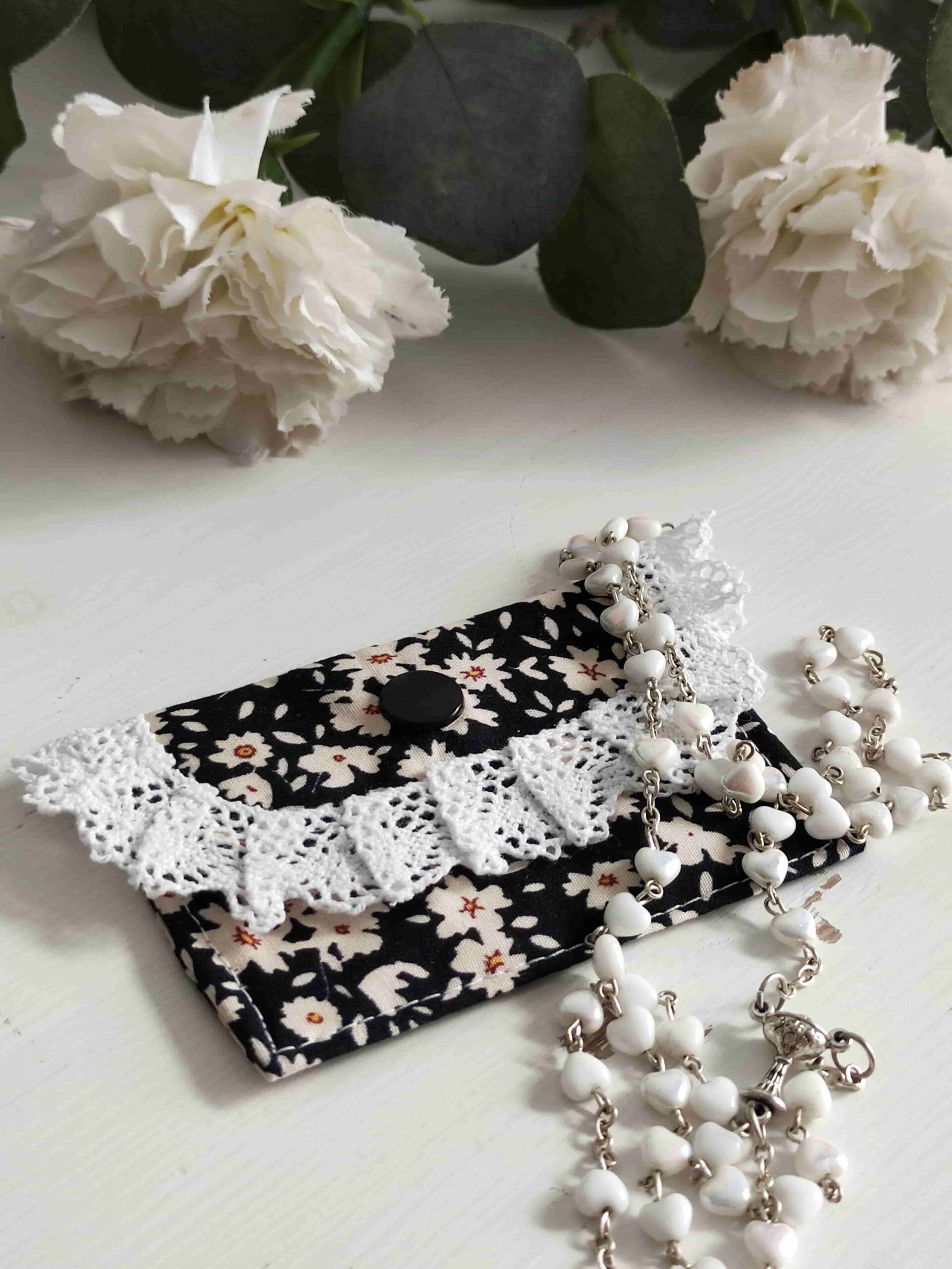 Napisz pierwszą opinię o „Etui na różaniec – czarno białe kwiatki z koronką”
