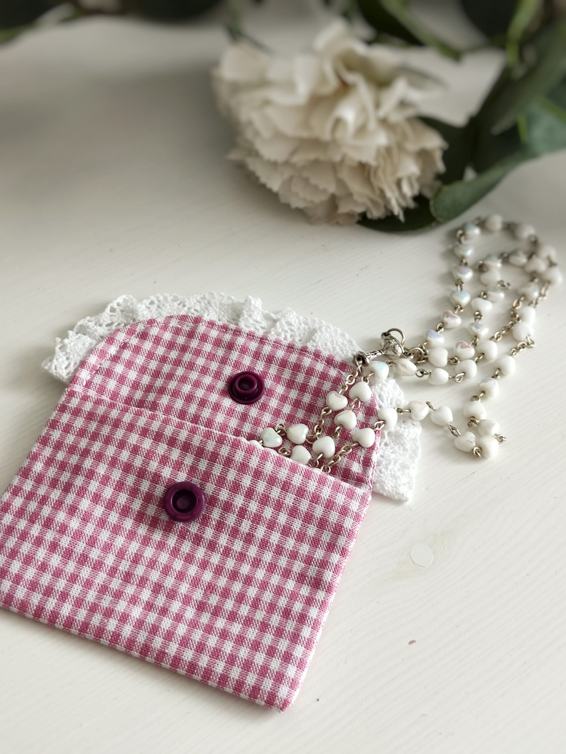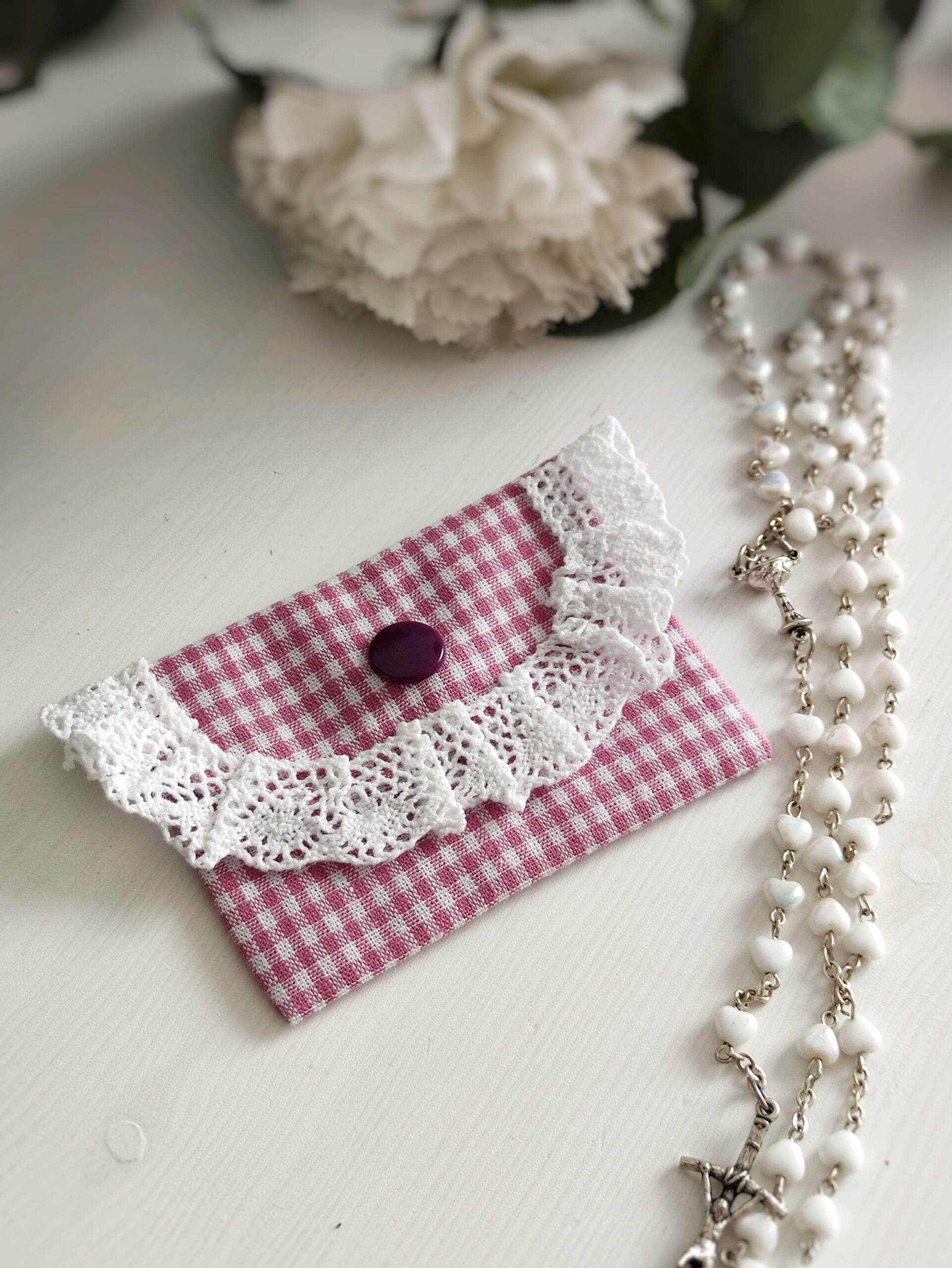 Napisz pierwszą opinię o „Etui na różaniec – różowa kratka z koronką”