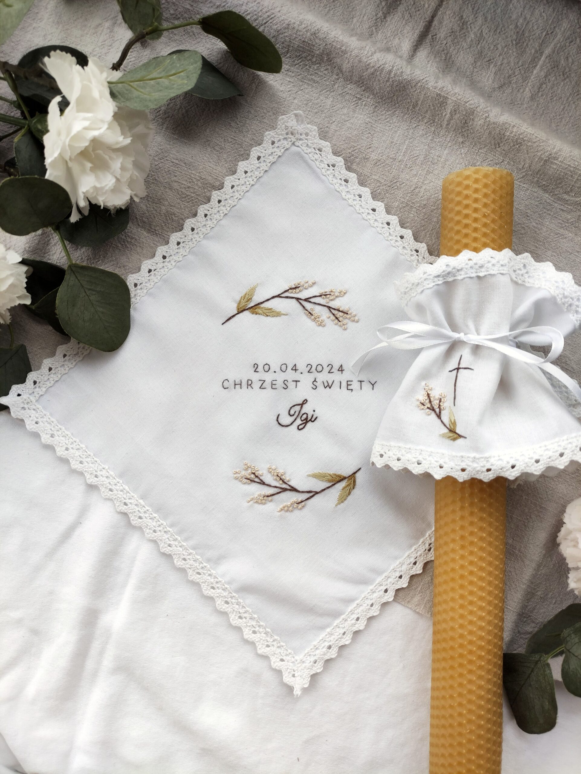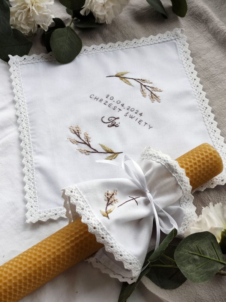 Haftowana personalizowana szatka do Chrztu Świętego oraz ozdoba na świecę. Polskie rękodzieło na zamówienie.