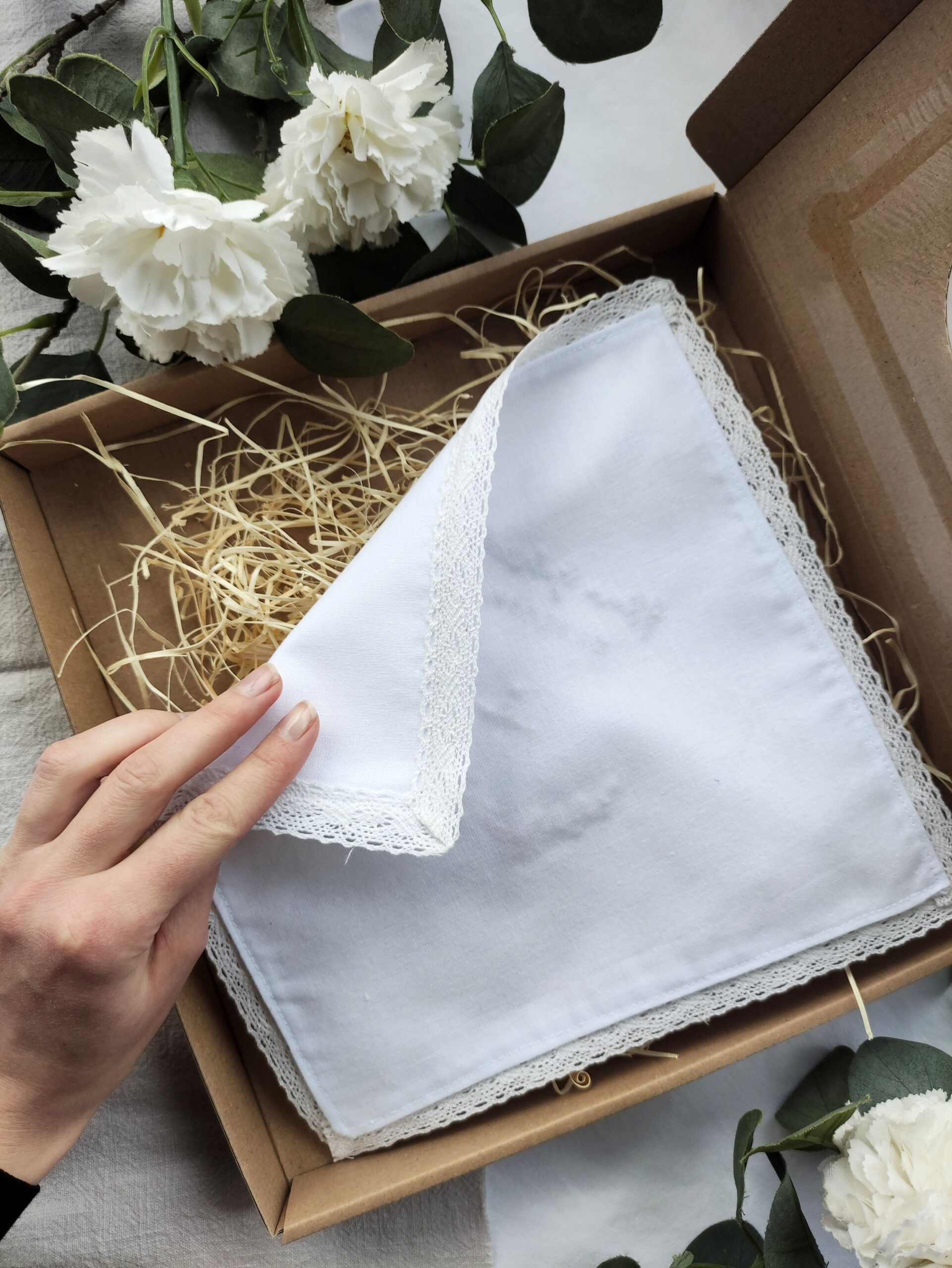 Tkanina bazowa – biała bawełna, nici bawełniane, koronka bawełniana.