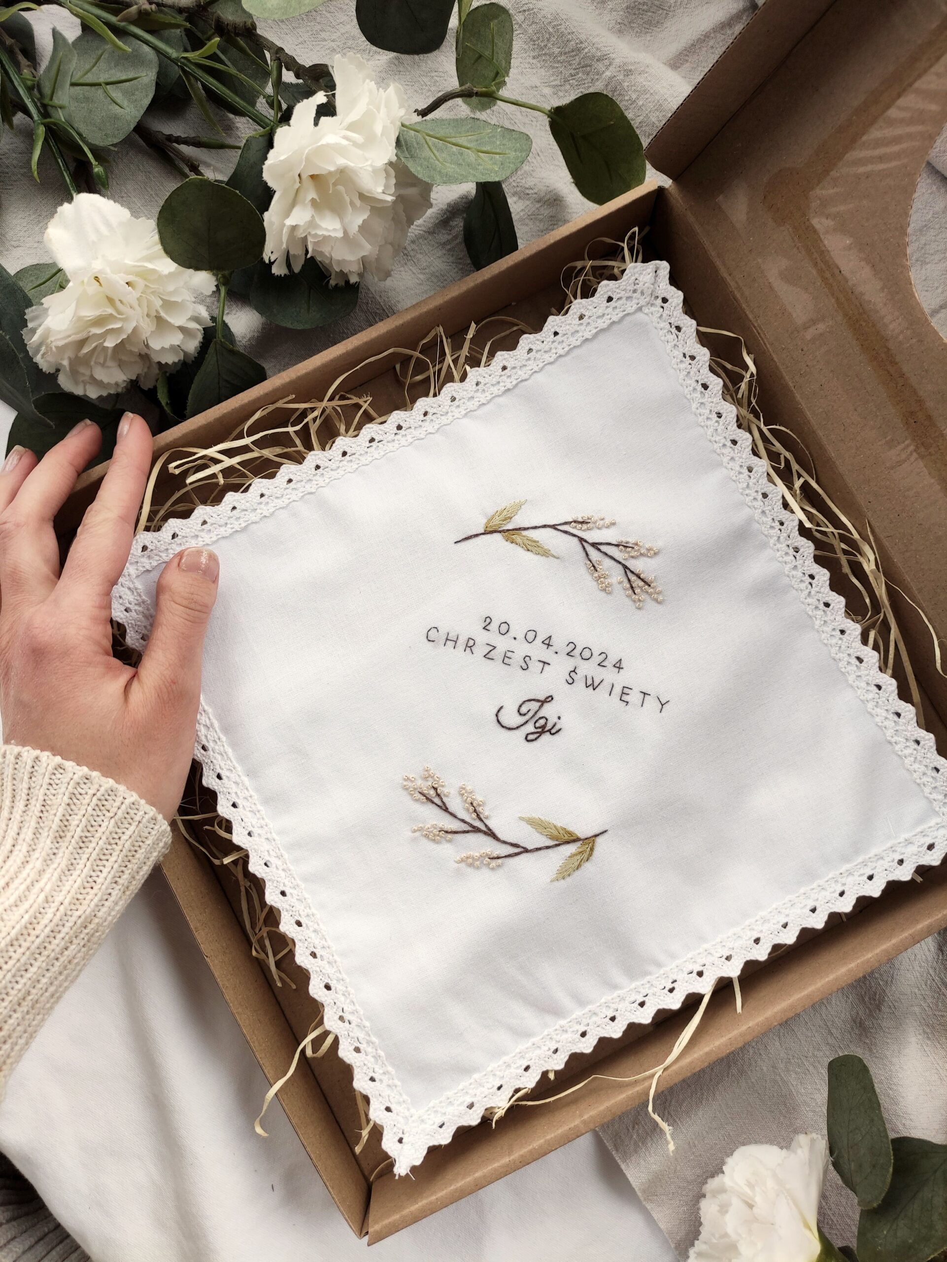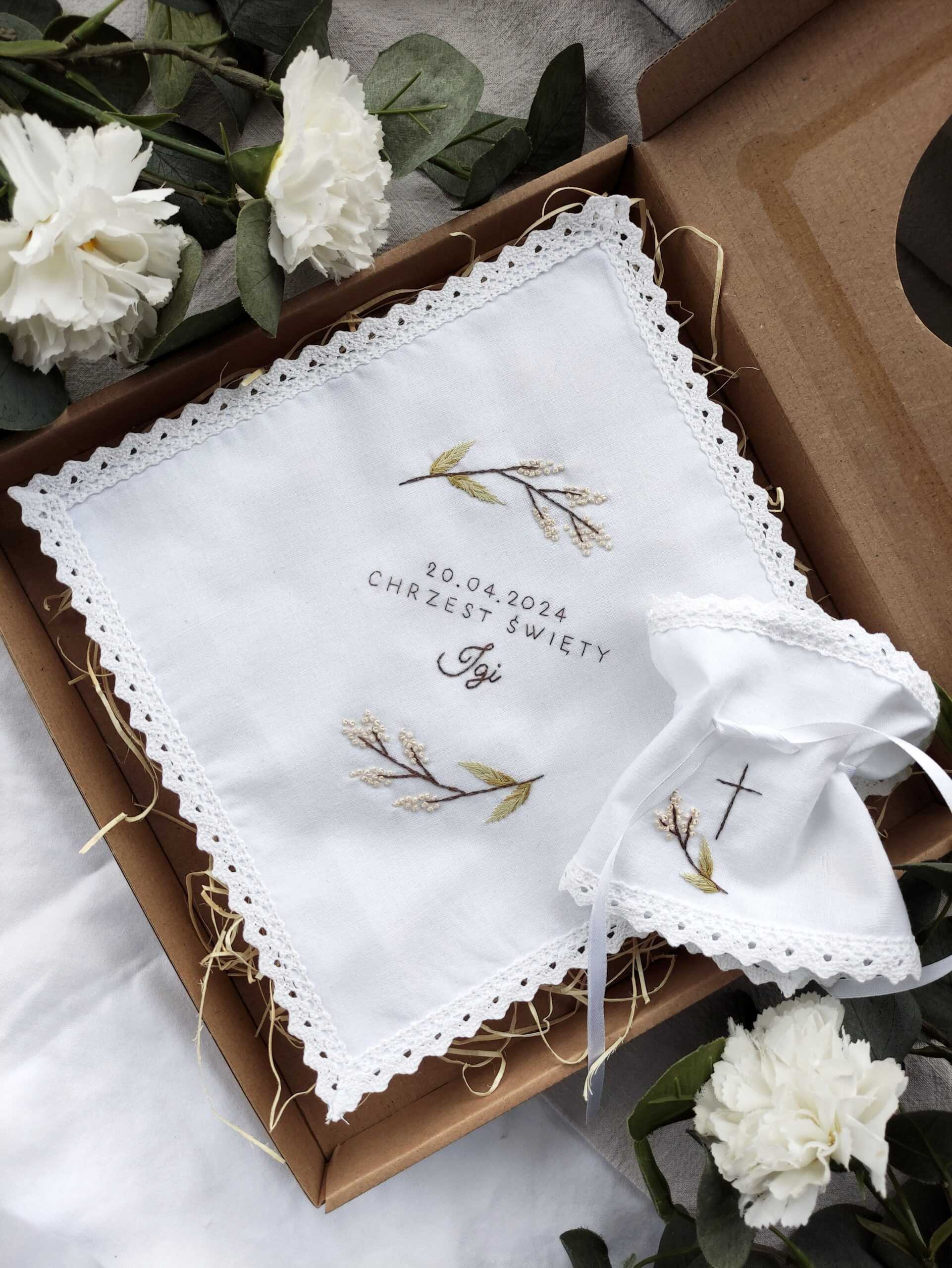 Ręcznie haftowana szatka do Chrztu Świętego będzie wspaniałym pomysłem na prezent z okazji Chrztu Świętego – piękna pamiątka na całe życie. W komplecie z profitką, czyli ozdobnym kołnierzykiem do świecy. Estetycznie zapakowane na prezent w eleganckie pudełko eco z okienkiem i wstążką.