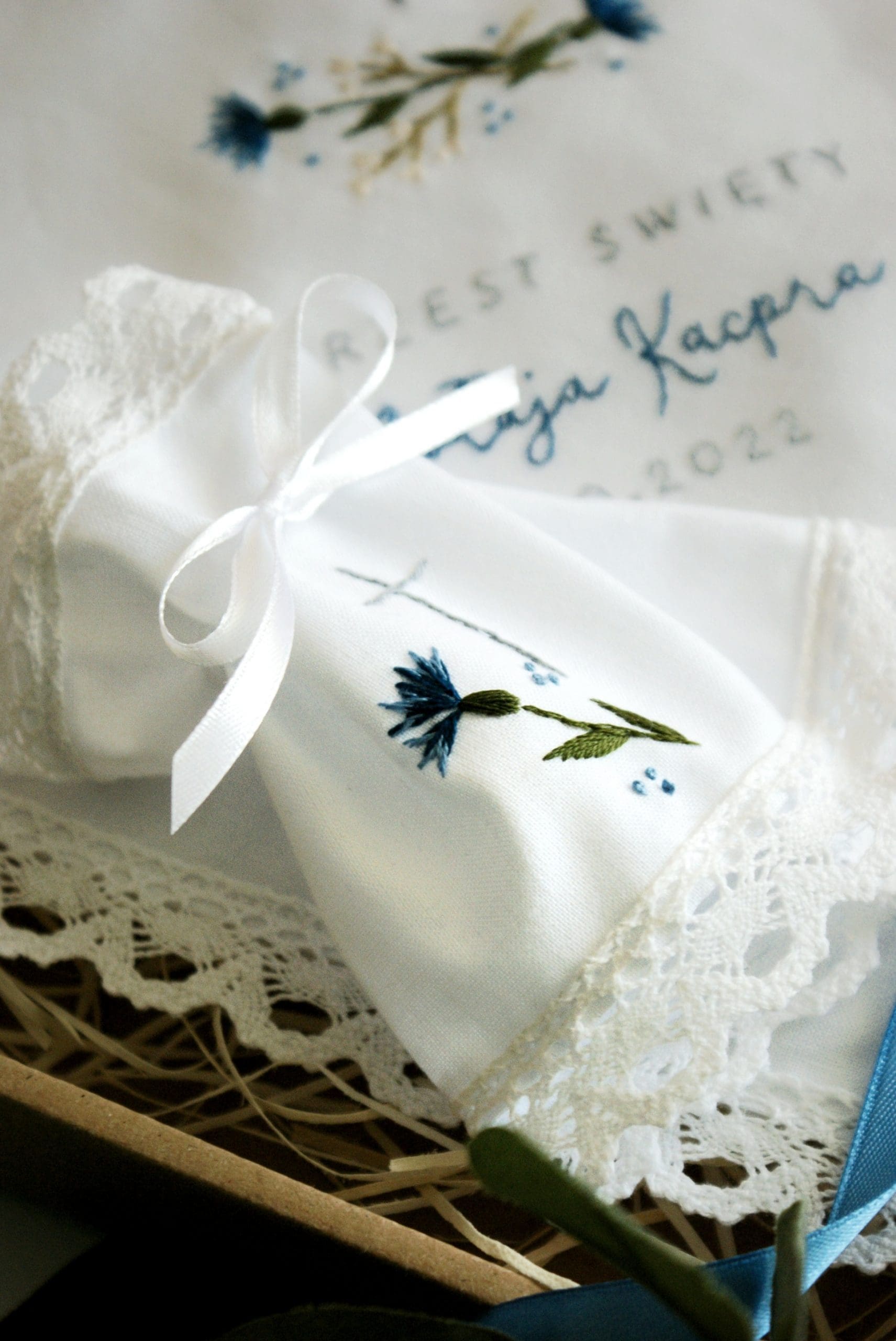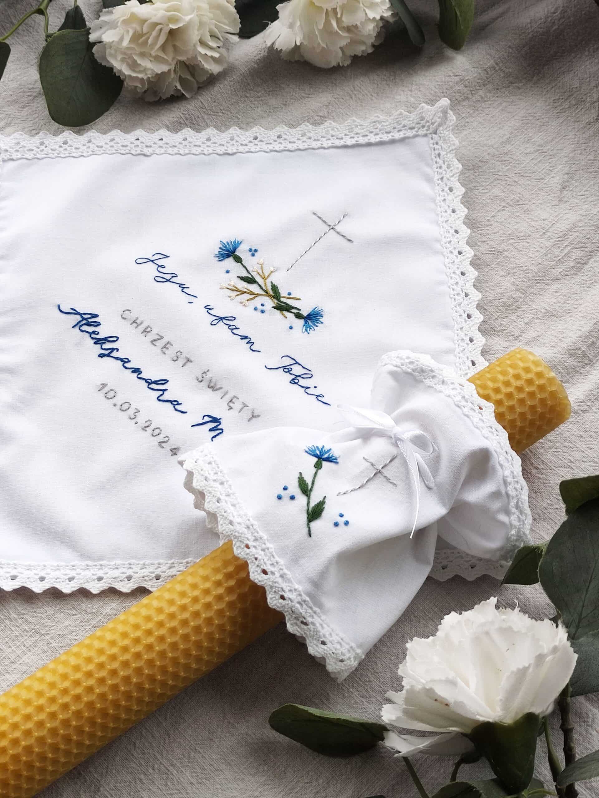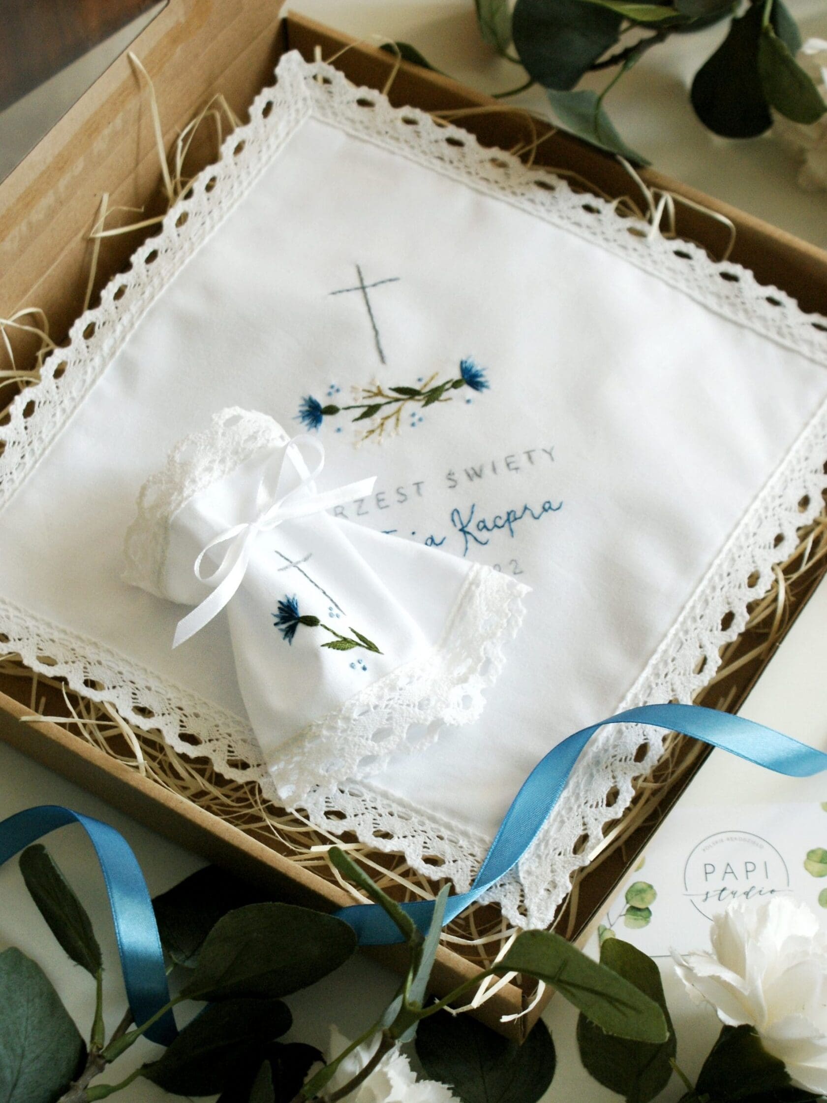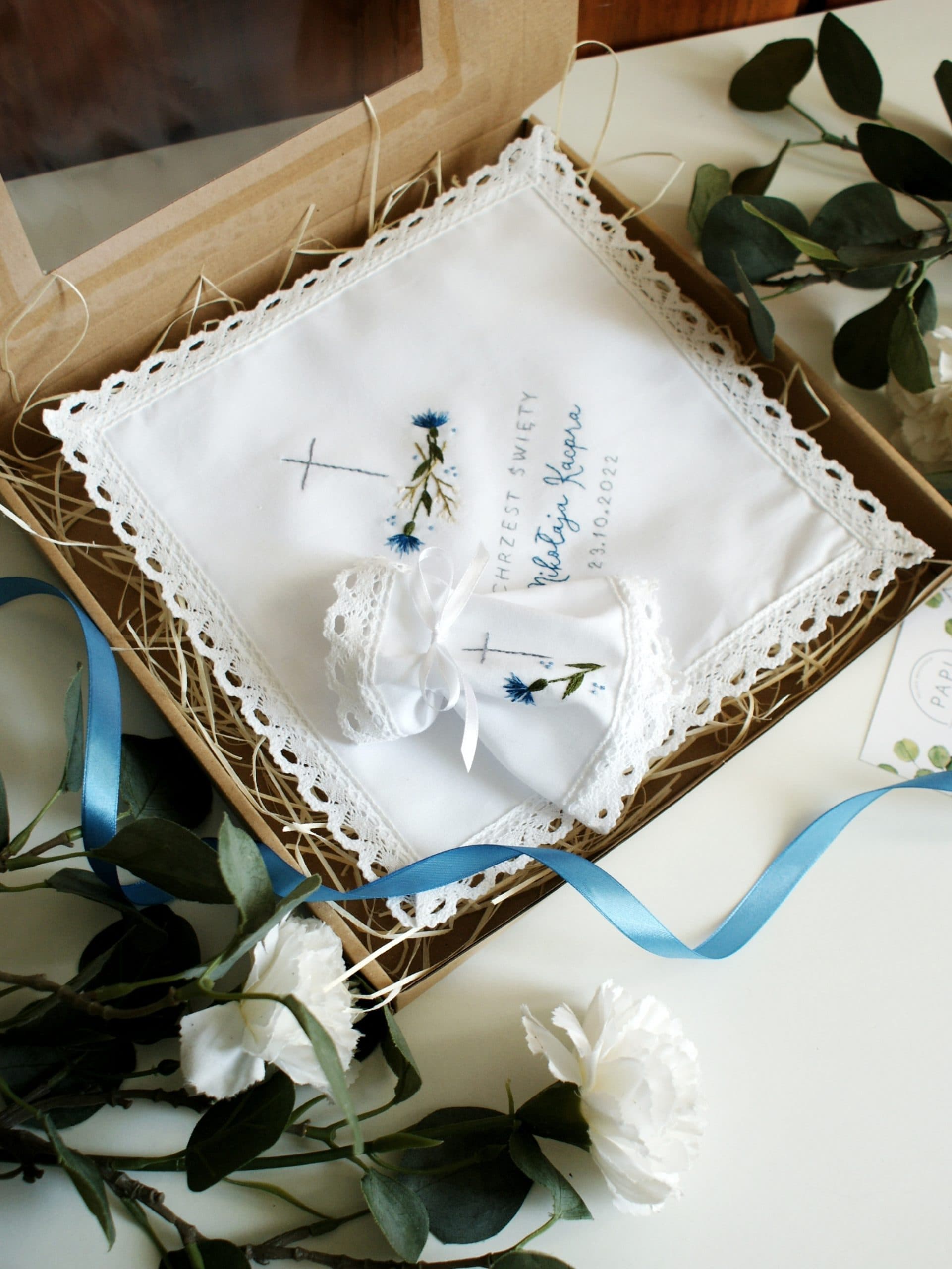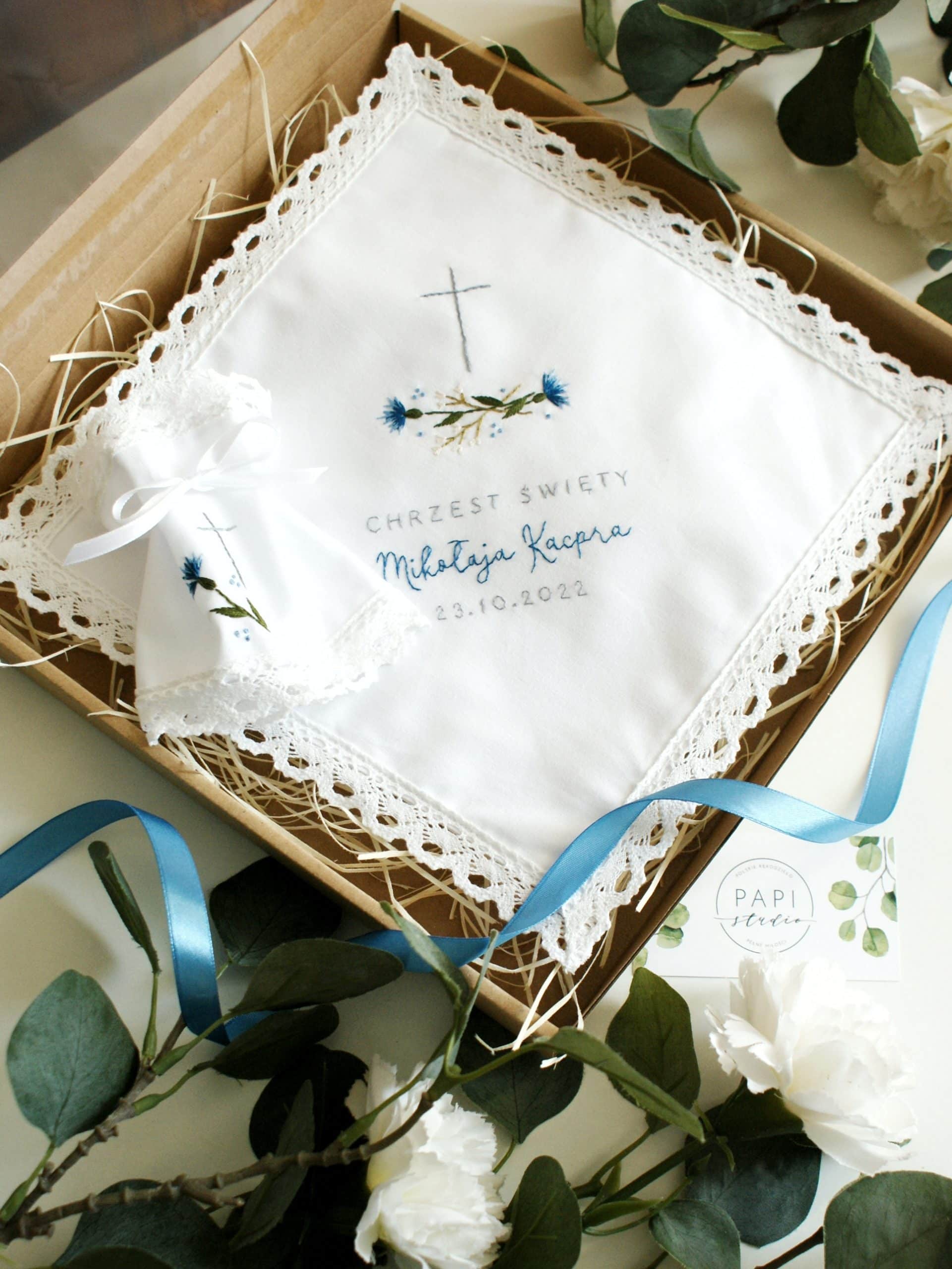 Ręcznie haftowana szatka do Chrztu Świętego będzie wspaniałym pomysłem na prezent z okazji Chrztu Świętego – piękna pamiątka na całe życie. W komplecie z profitką, czyli ozdobnym kołnierzykiem do świecy. Estetycznie zapakowane na prezent w eleganckie pudełko eco z okienkiem i wstążką.