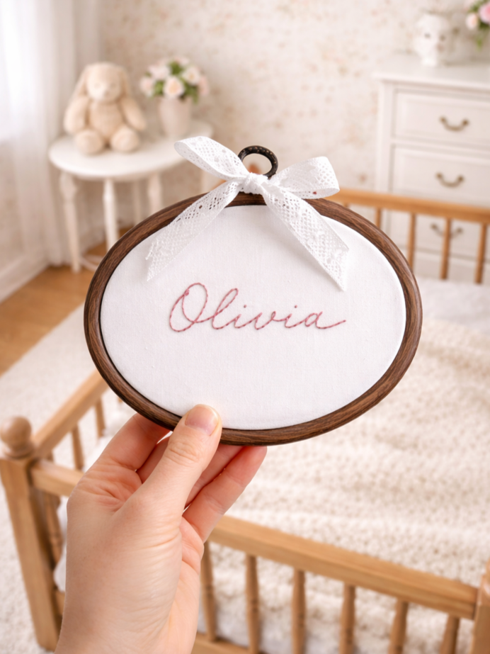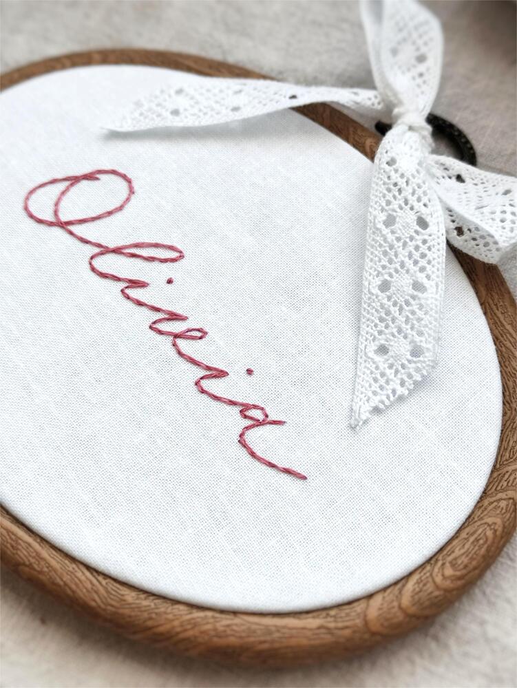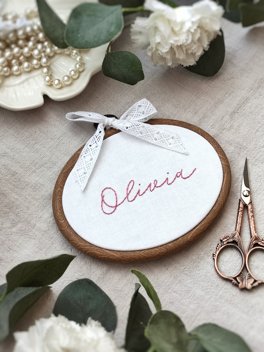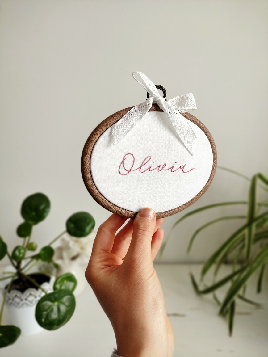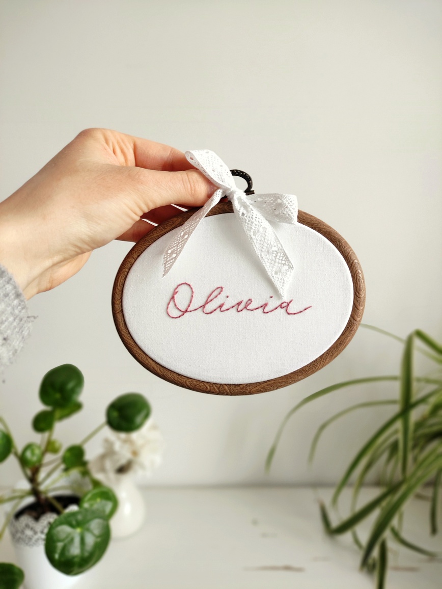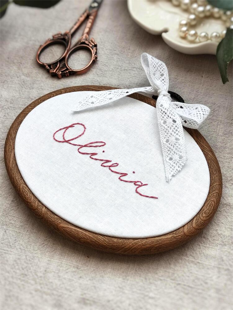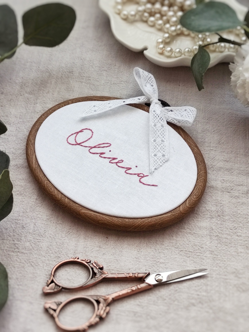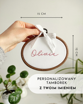 Ręcznie haftowany obrazek z Twoim imieniem. Piękny, klasyczny owalny tamborek – uniwersalny personalizowany prezent.