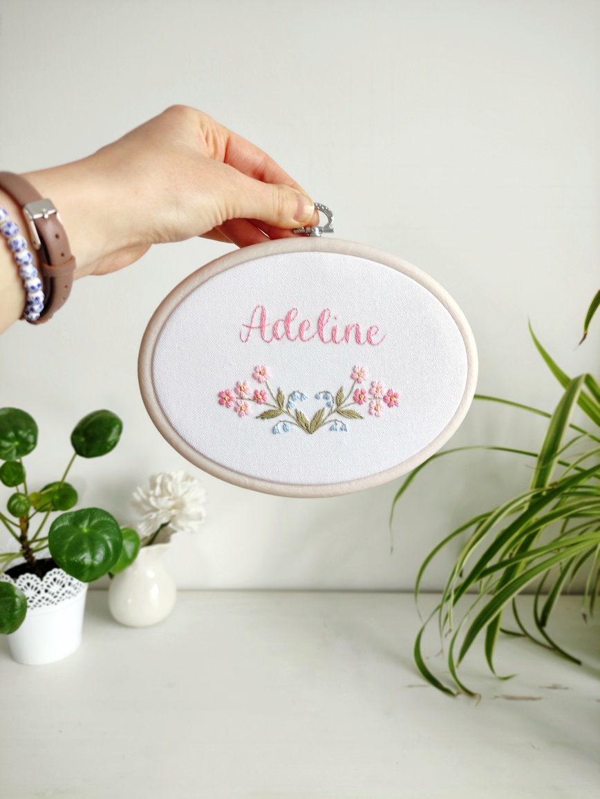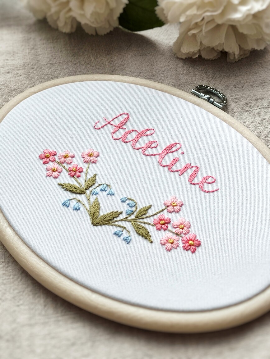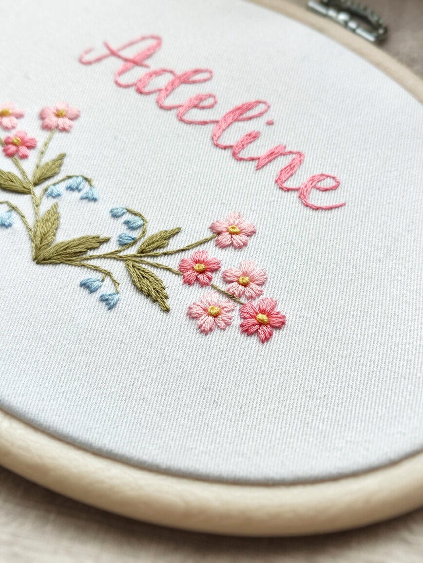 Ręcznie haftowany personalizowany obrazek z Twoim imieniem i kwiatkami.