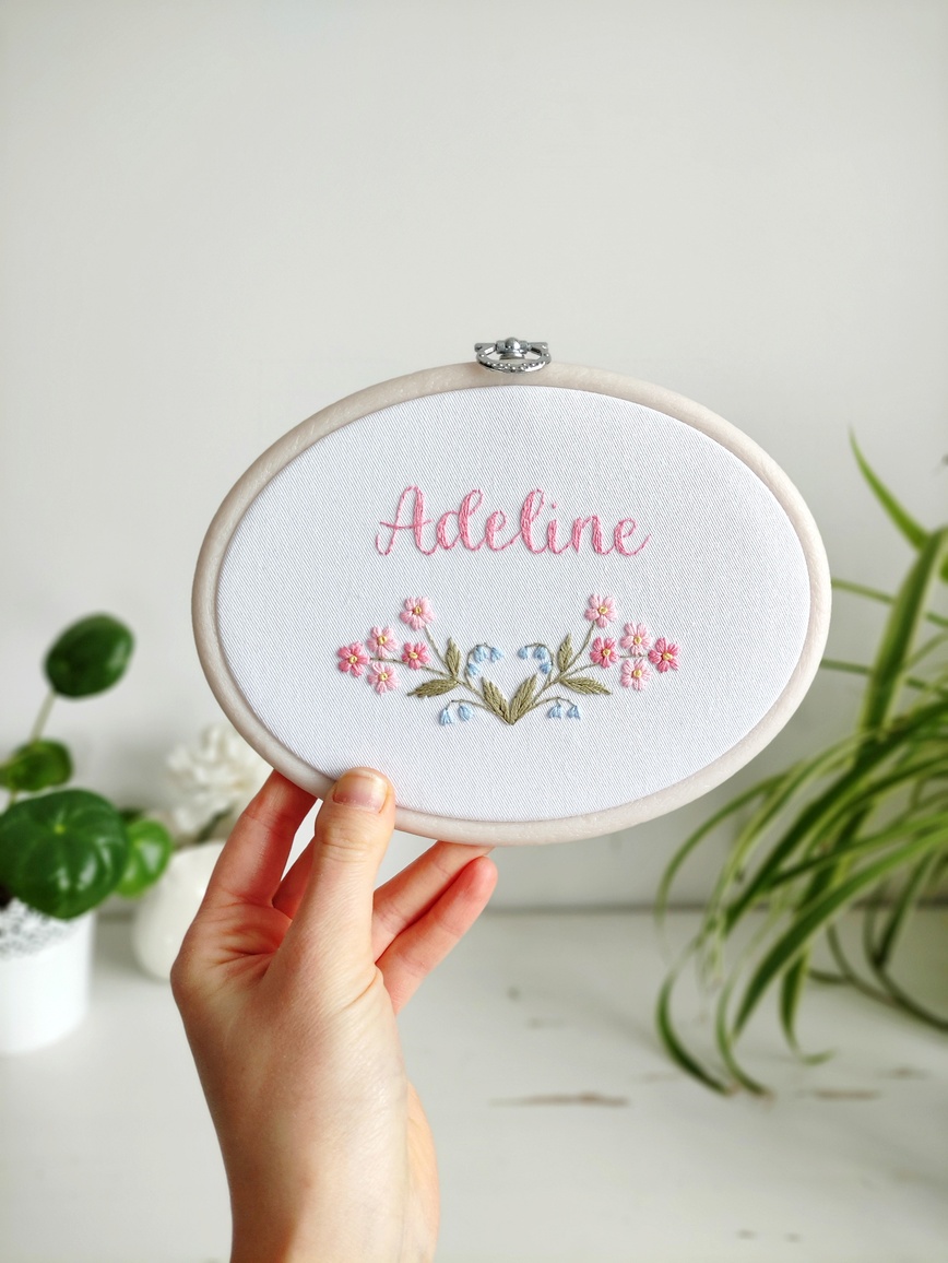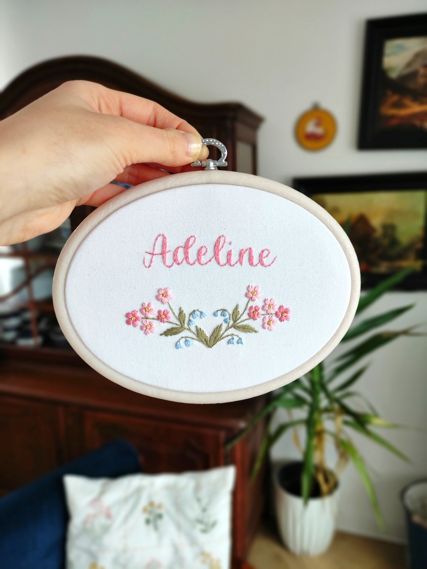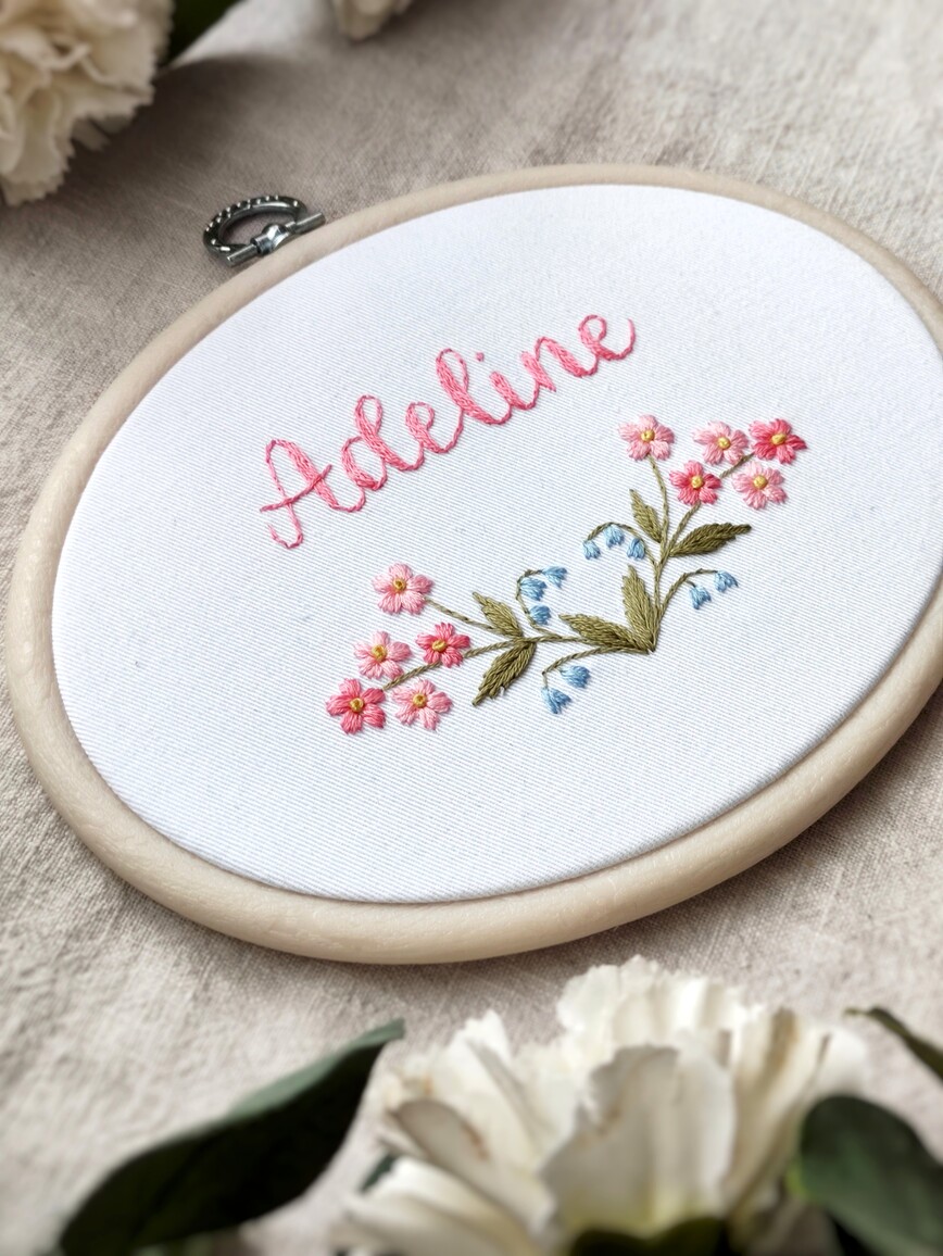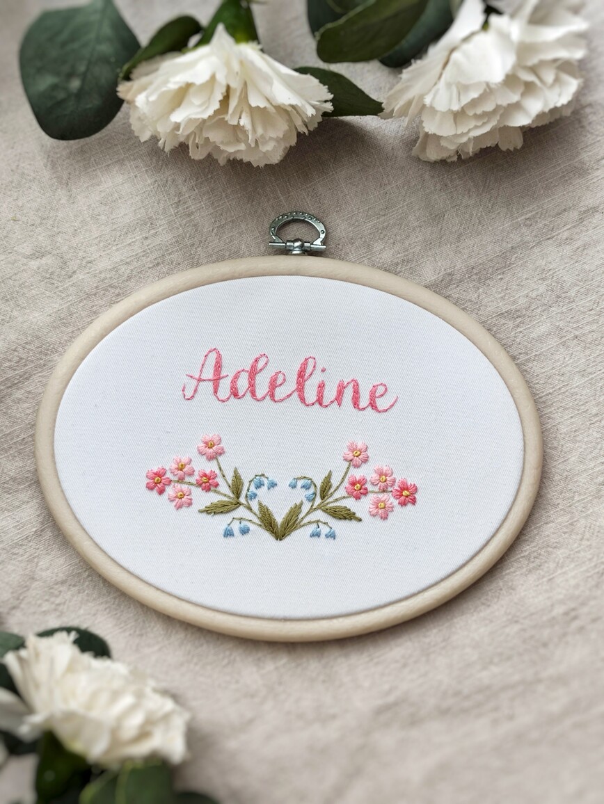 Ręcznie haftowany personalizowany obrazek z Twoim imieniem i kwiatkami.