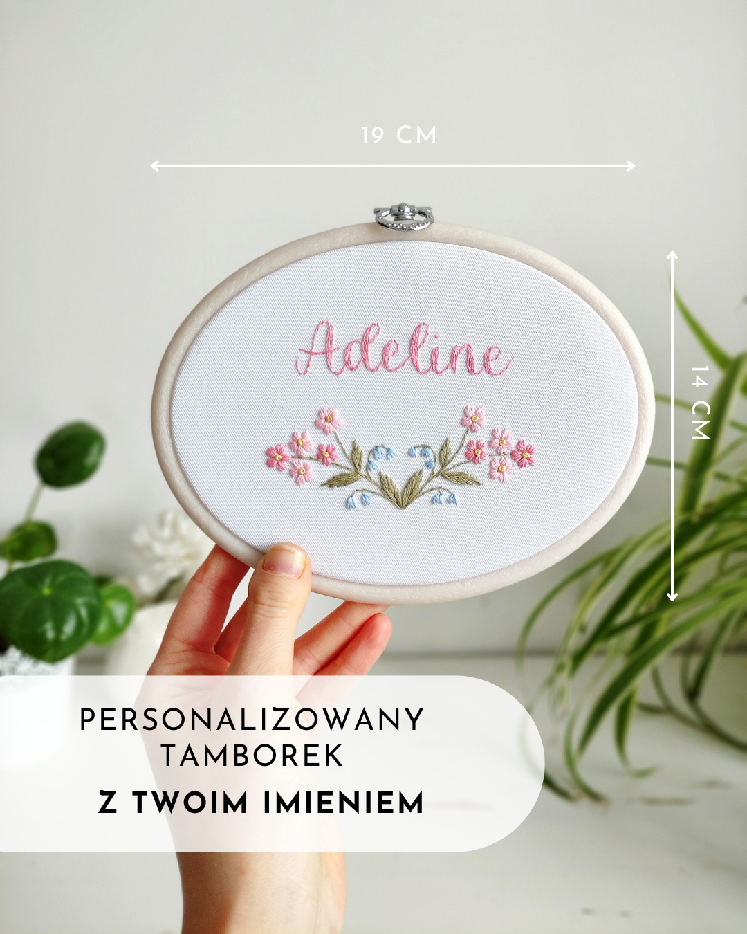 Szukasz prezentu, który stanie się niepowtarzalną pamiątką na całe życie? Ten ręcznie haftowany tamborek z haftowanym imieniem i kwiatkami to doskonały wybór! Kolorystyka w odcieniach pastelowego różu, błękitu i zieleni doskonale wpisuje się w romantyczny, pełen uroku klimat, który zachwyci każdego, kto zobaczy ten obrazek na ścianie. Pasuje świetnie do wnętrz klasycznych, w stylu rustykalnym lub wiejskim.