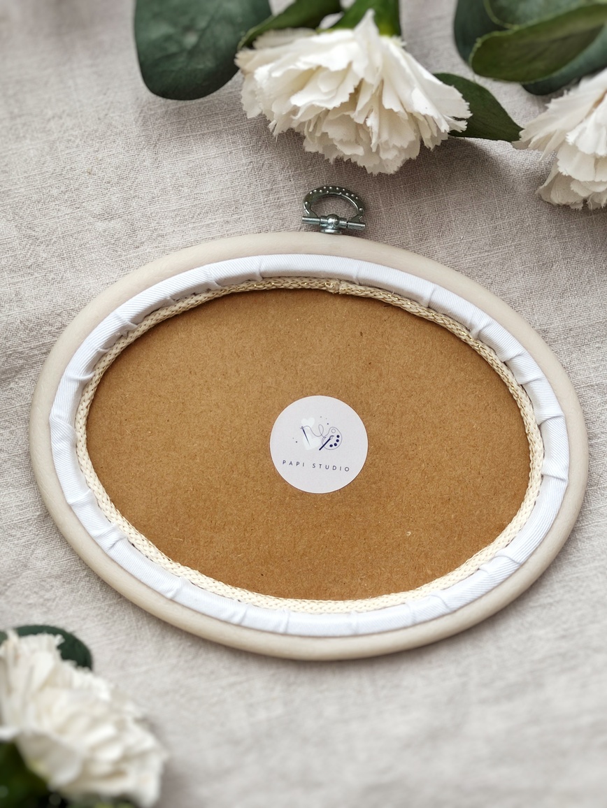 Obrazek jest oprawiony w owalny biały tamborek ze srebrnym uchwytem. Jest od razu gotowy do zawieszenia na ścianie. Zapakowany w kartonik ze wstążką.