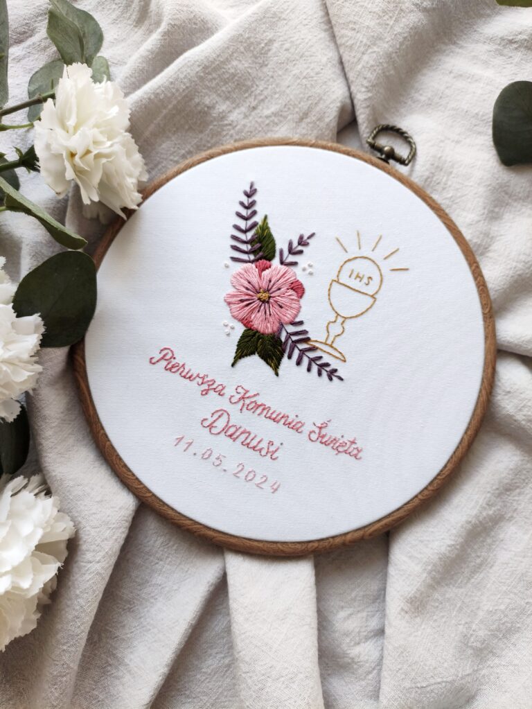 Ręcznie Haftowany Tamborek – Pamiątka Pierwszej Komunii Świętej
