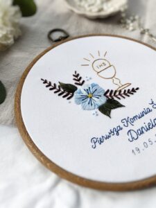 Decydując się na moją ręcznie haftowaną pamiątkę, wybierasz coś ponadczasowego, co zachowa pamięć o Pierwszej Komunii Świętej przez wiele lat. To idealny sposób na stworzenie niezapomnianego wspomnienia, które będzie towarzyszyć dziecku przez całe życie.