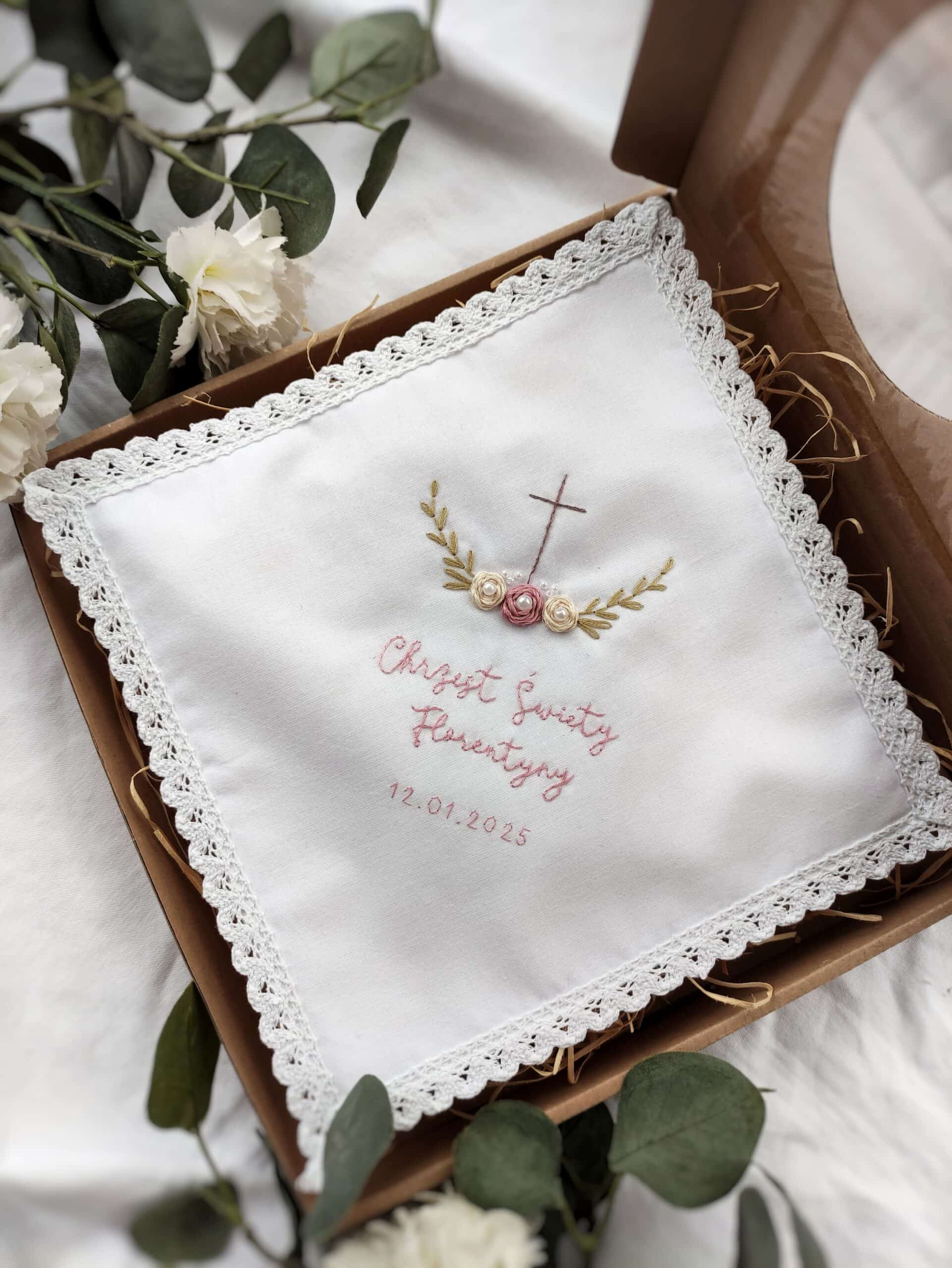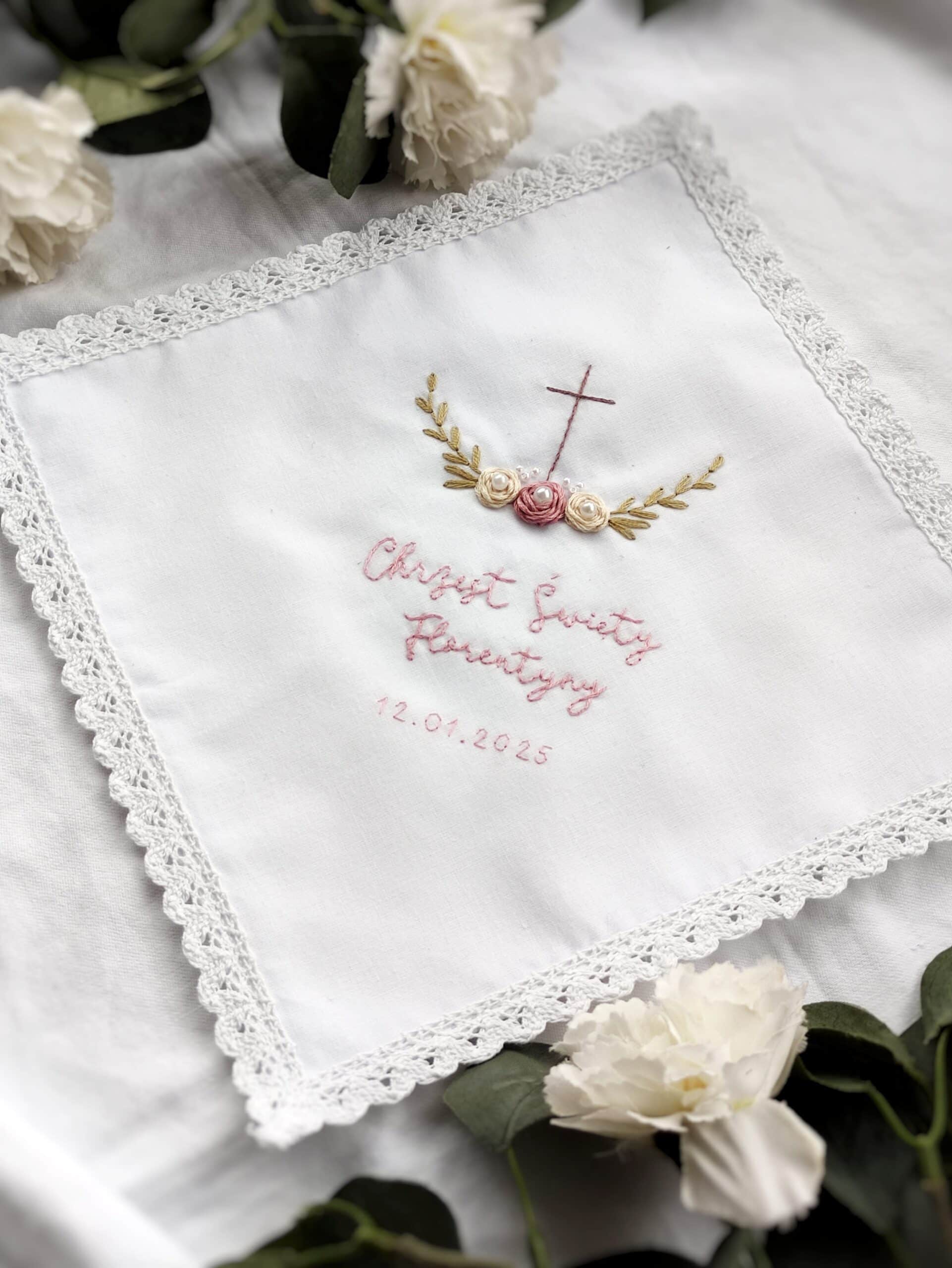 Biała szatka na Chrzest Święty z haftem ręcznym, perełkami i koronką – to przepiękna pamiątka na całe życie. Haftuję na niej imię dziecka oraz datę uroczystości, ozdabiam haftowanymi kwiatami. Dzięki temu taki prezent zdecydowanie wyróżnia się wśród podarunków.